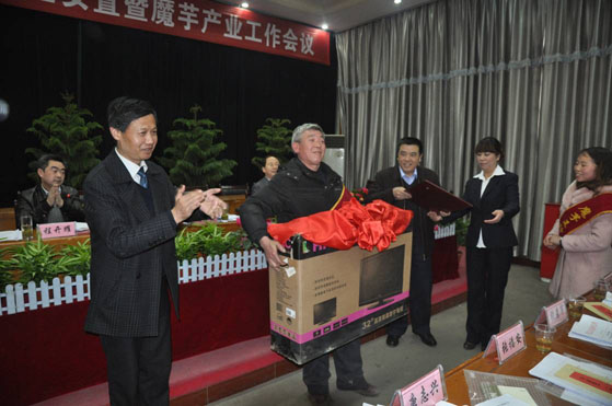 会上表彰奖励了2011年魔芋产业发展工作4个先进镇、4个先进村、2个先进企业、8名种植大户、2名“魔芋王”种植户。